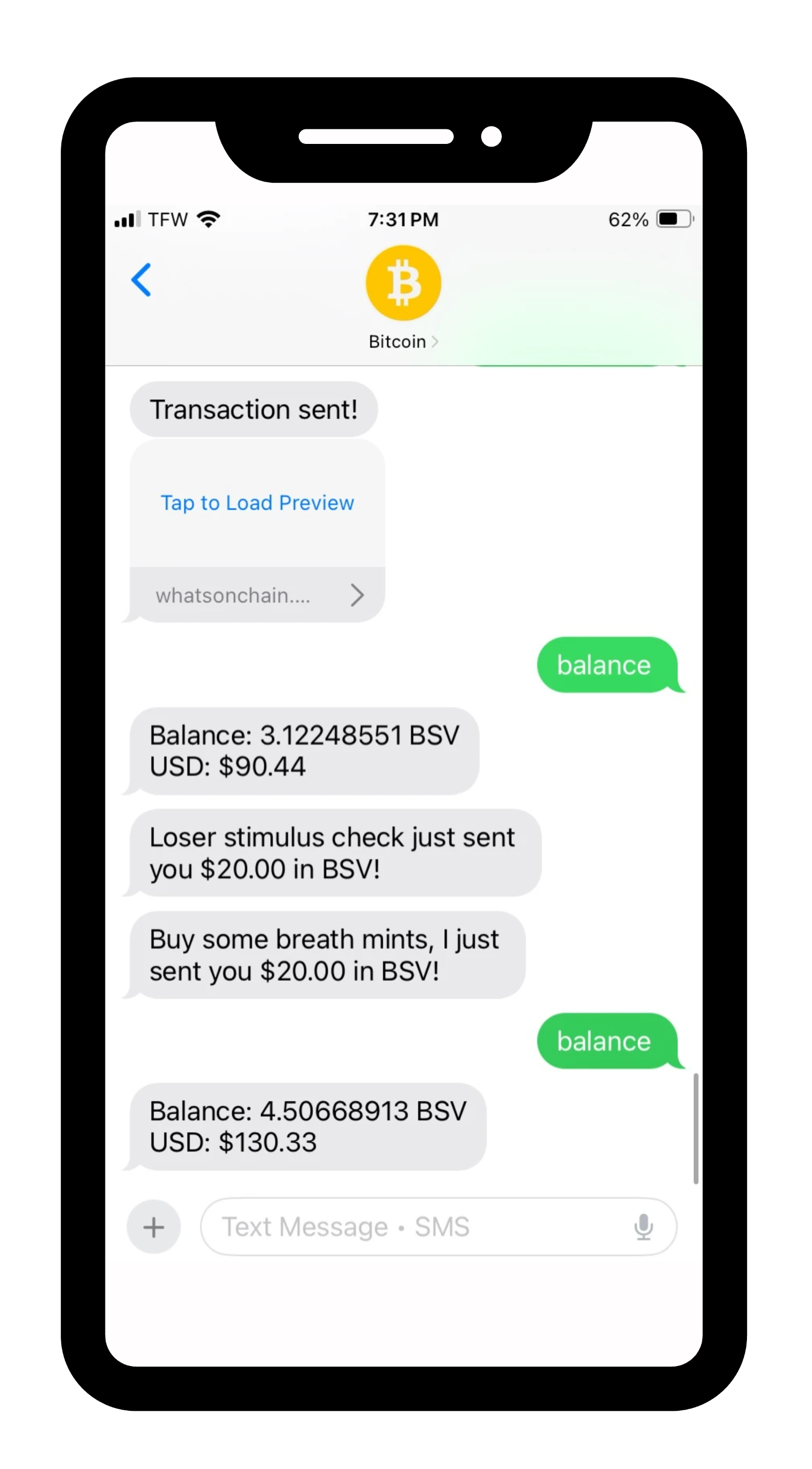 $10 in BSV sent to phone number you enter